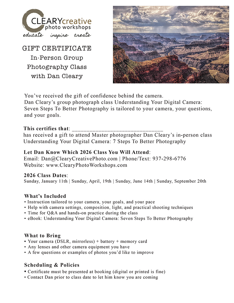The next In-person group class is Sunday, January 11th, 2026, at 1 pm at Dan Cleary’s studio. It’s $119 per person and includes a free copy of his eBook, Understanding Your Digital Camera.