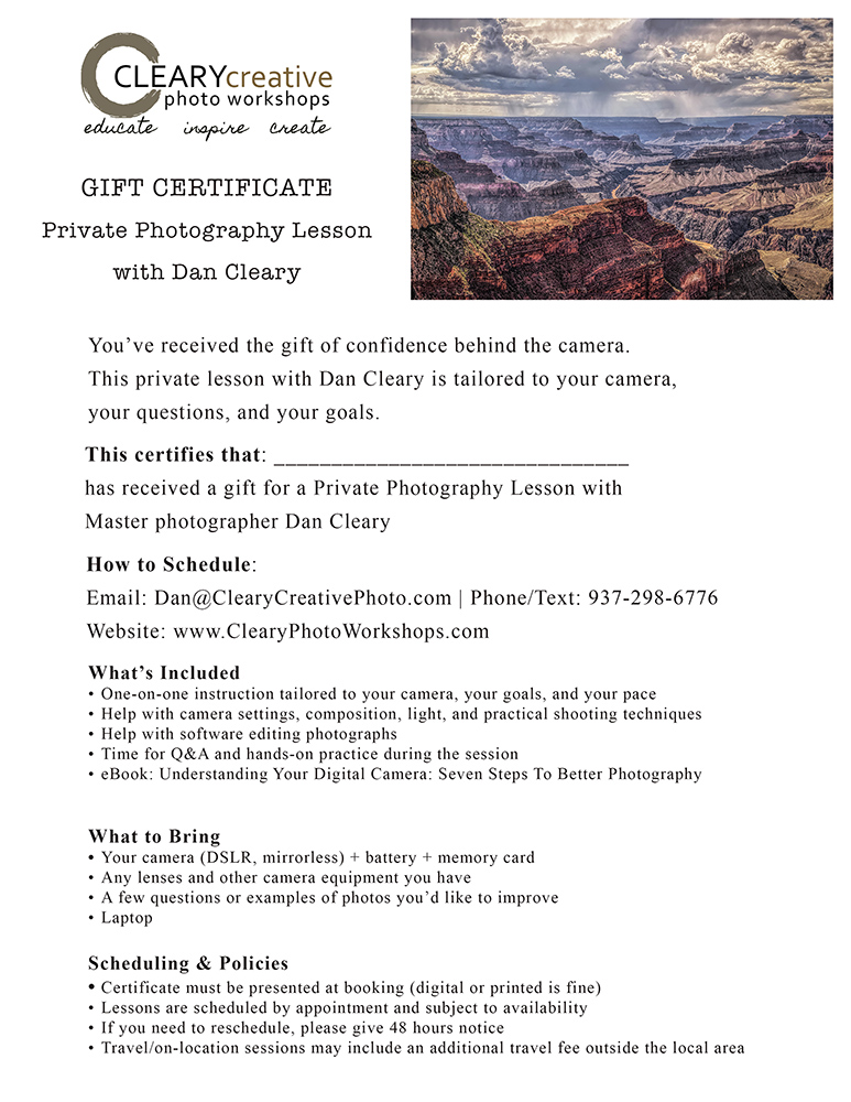 Hi, I’m Dan Cleary, and my photography workshops are built for real learning—simple, practical, and personal. I use plain talk and don’t use jargon you don’t understand. My step-by-step method helps you finally understand what your camera is doing and how to control it with confidence.