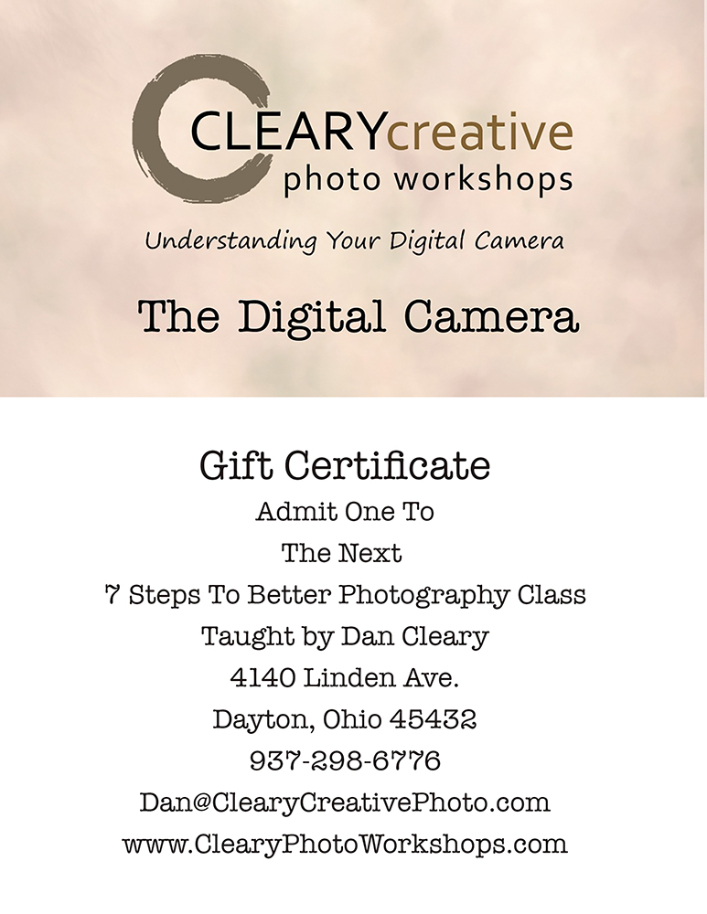 Make someone’s year with a Cleary Photo Workshops Gift Certificate—perfect for new camera owners and “rusty returners.” They can use it for Dan’s one-day Seven Steps class or private 1-on-1 lessons. Delivery by email or Dan will print it on nice paper for holiday delivery, and there’s no expiration.